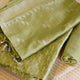 A symphony of tradition and subtle elegance, this Ice Blue Banarasi Munga Muslin suit set reflects the quiet luxury of handwoven artistry. The fabric is delicately adorned with zari butis, shimmering softly against the earthy green base, while the dupatta is enhanced with an ornate Banarasi border and woven patterns that speak of timeless craftsmanship.