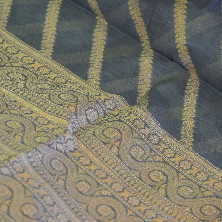This Charcoal Grey Banarasi suit fabric is a masterpiece of traditional weaving. The fabric features bold vertical stripes of intricate golden zari, lending a rich, elongated silhouette when stitched. The borders showcase detailed floral and paisley-inspired zari motifs that enhance the grandeur of the piece.
