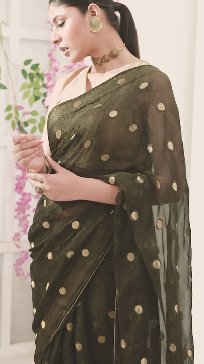 The shimmer saree with golden polka dots is a chic blend of classic charm and contemporary glamour. It is paired with a shimmery tissue blouse for a contrasting effect.