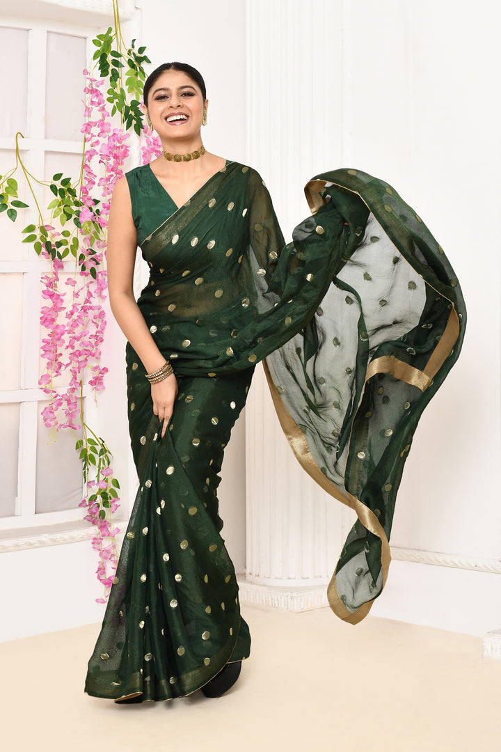 The shimmer saree with golden polka dots is a chic blend of classic charm and contemporary glamour. It is paired with a shimmery tissue blouse for a contrasting effect.