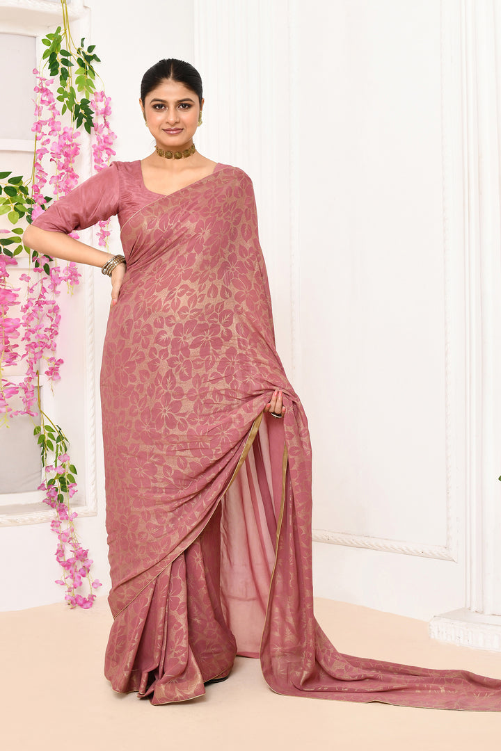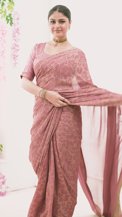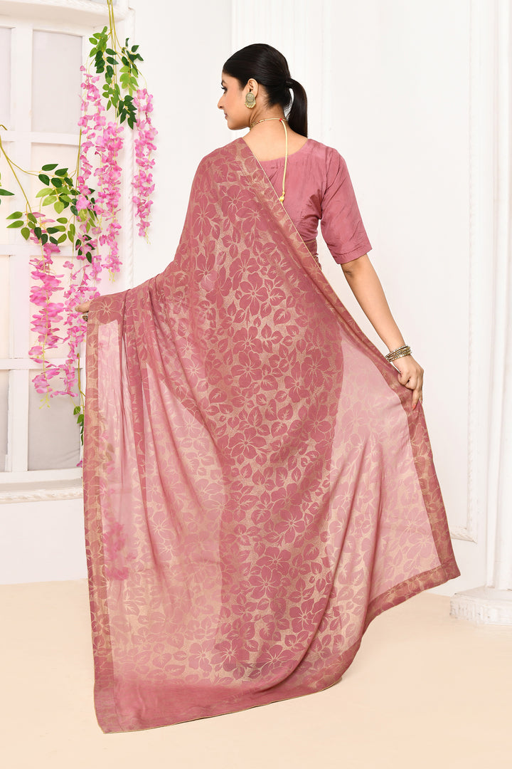 The lightweight chiffon saree with floral golden print is an elegant and lightweight attire that exudes sophistication and grace. The saree is made of chiffon, a soft, sheer, and flowy fabric known for its breathable and delicate texture. It drapes beautifully, enhancing the wearer's silhouette. The shimmering gold accents add a touch of luxury and make it suitable for festive occasions. The saree comes with a complimenting plain crepe blouse piece. Perfect for weddings, festive celebrations, and formal gatherings, this saree combines traditional charm with a modern aesthetic. Its lightweight nature ensures comfort while maintaining an effortlessly regal appearance.