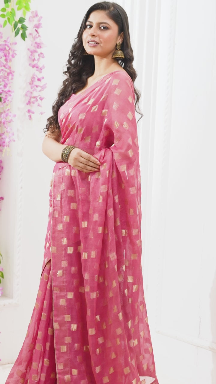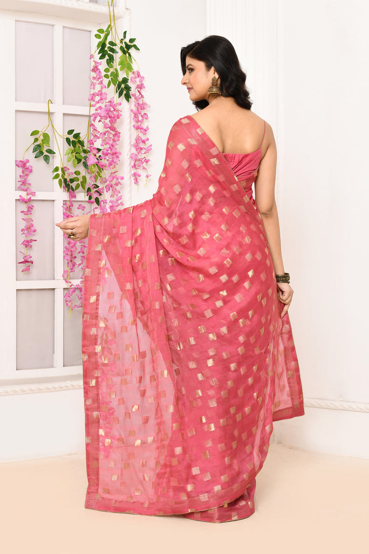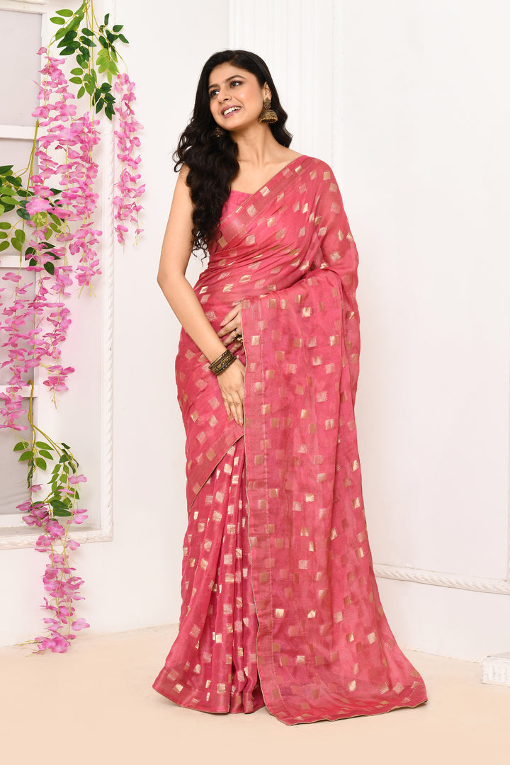 Jute Upada golden checker pattern saree-Onion pink