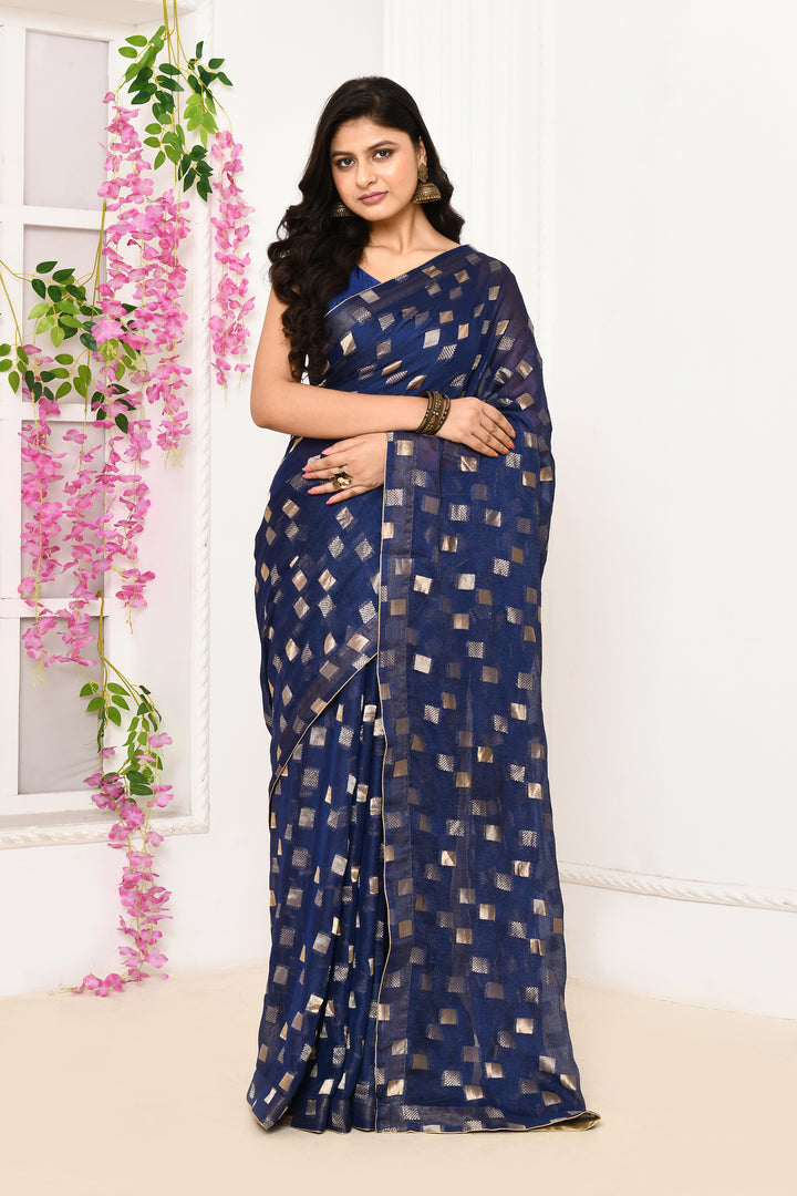 Jute Upada golden checker pattern saree-Royal blue