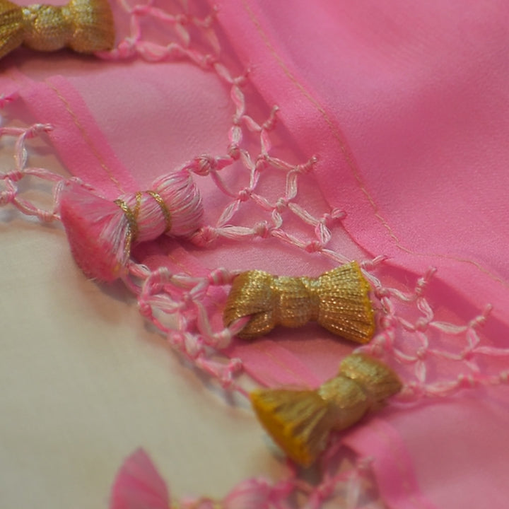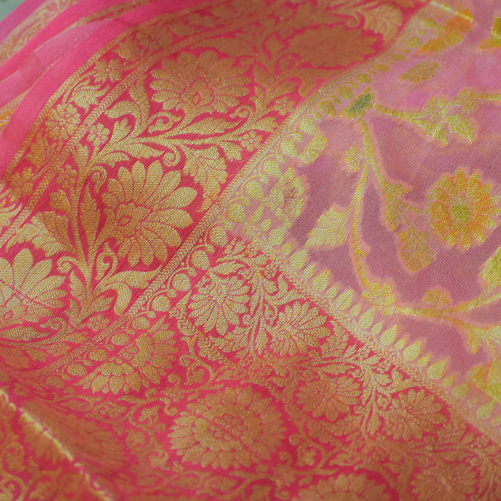 This Pink Banarasi suit fabric is a vibrant celebration of tradition and elegance. Adorned with intricate golden zari weaving in blooming floral patterns, the fabric radiates festive charm. The luminous contrast of gold against the bright pink base makes it a striking choice for weddings, festivals, and special gatherings.
