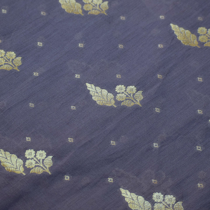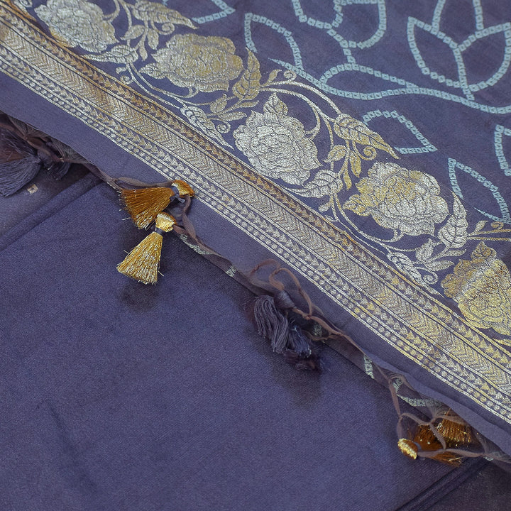 This unstitched Banarasi Munga Muslin suit set in a deep royal purple is a statement in itself — a perfect harmony of bold color and refined heritage craftsmanship. The fabric is adorned with Banarasi-inspired floral zari motifs and winding vine patterns, creating an elegant rhythm across the body. What makes this piece truly distinctive is the dual-toned zari weaving — a delicate blend of soft silver and antique gold threads, adding depth, dimension, and subtle brilliance.