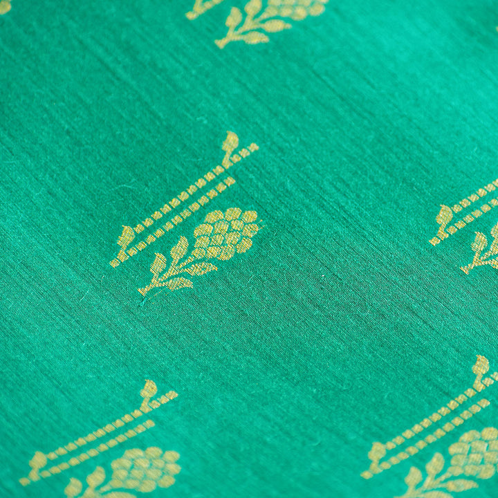 Immerse yourself in the finesse of Banarasi weaving with this radiant Sea Green handwoven suit set. The fabric is adorned with delicate golden zari floral motifs, while the dupatta carries a finely woven traditional border featuring geometric and floral artistry.